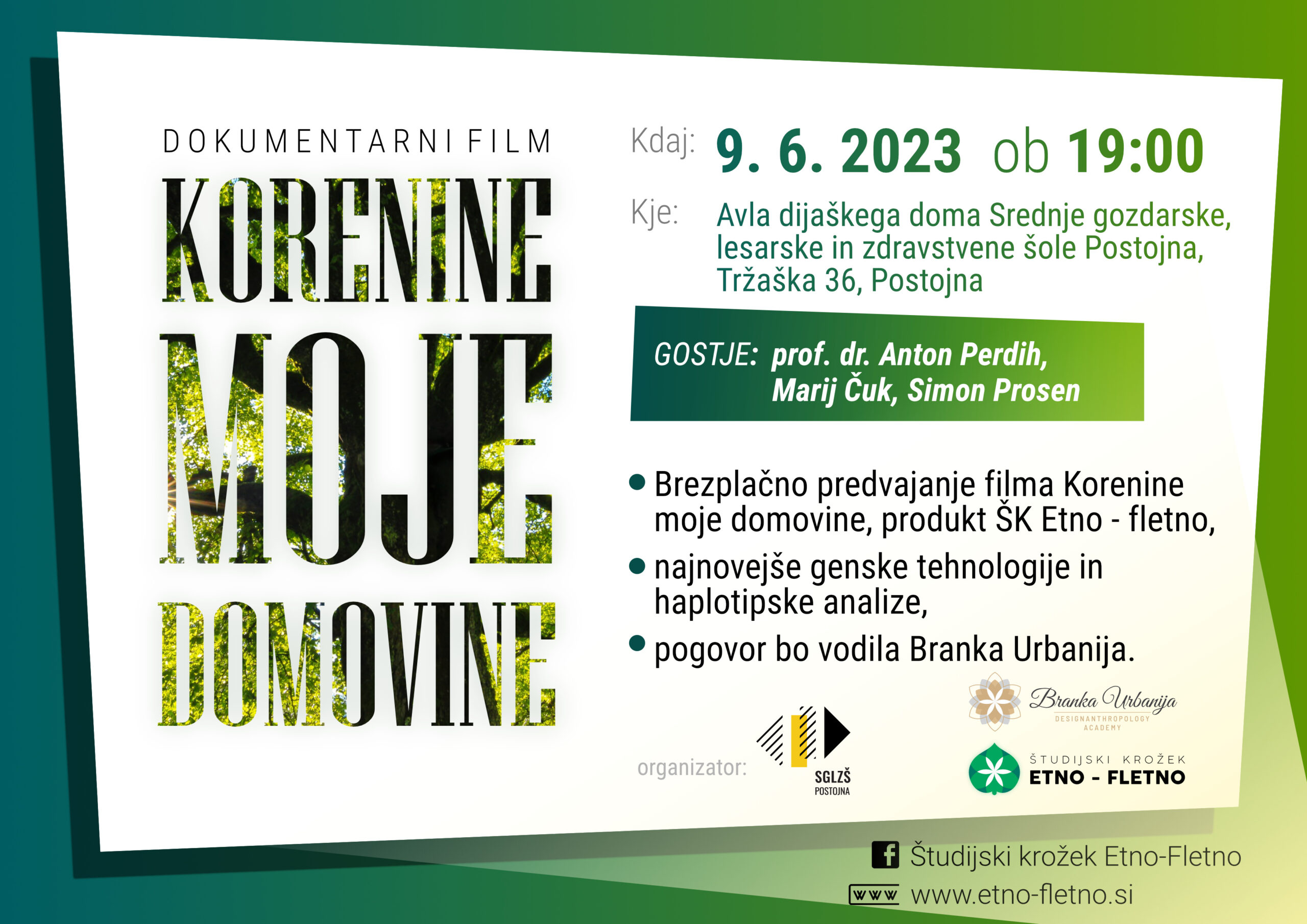 Prijazno povabljeni na prav poseben večer, ki se bo zgodil v petek 9. junija 2023 v avli dijaškega doma SGLZŠ Postojna. Ob sedmih pod večer vas čakajo trije od 17. ustvarjalcev, ki so stkali zgodbo dokumentarnega filma Korenine moje domovine. Svoja videnja in raziskave bodo akterji 36 minutnega filma po projekciji v vodenem pogovoru z Branko Urbanija podelili z vami. Na voljo vam bodo pa tudi v sproščenem pogovoru v zadnjem delu večera. Informacija in vabilo se nahaja tudi v priponki.